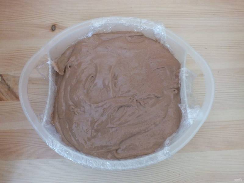 Чашу для риса оберните пищевой пленкой и перелейте в нее тесто. Разровняйте верх.