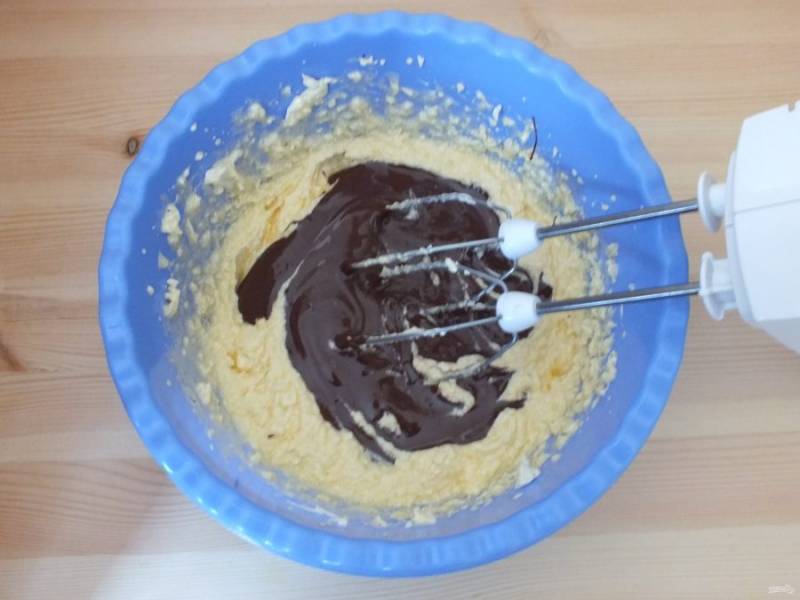 Добавьте шоколад в желтково-масляную массу. Взбейте до однородного состояния.
