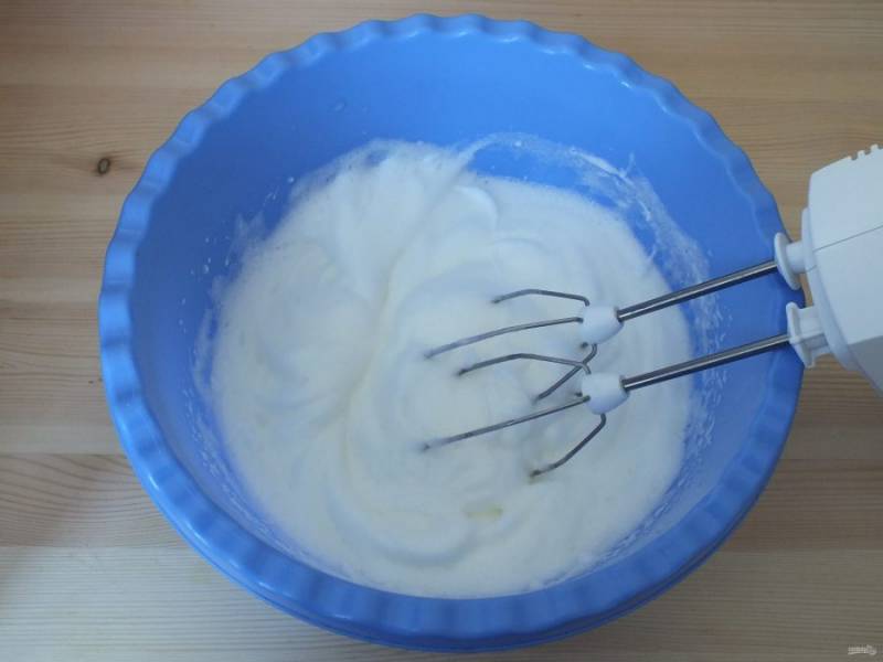 Белки взбейте до мягких пиков и уберите в холодильник.