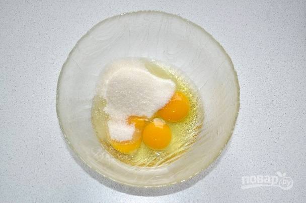 Параллельно с выпечкой песочного коржа можно заняться бисквитным тестом. В глубокую мисочку вбейте яйца и добавьте сахар. Взбивайте до пышность 3-4 минуты.