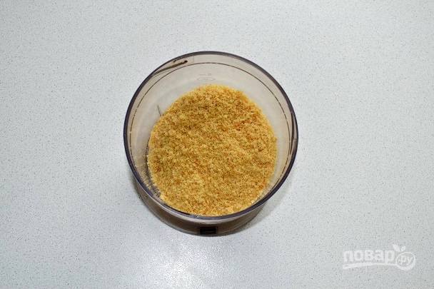 Обрезки измельчите в крошку. Если вы печете круглые коржи по одному, третий корж пойдет на крошку.
