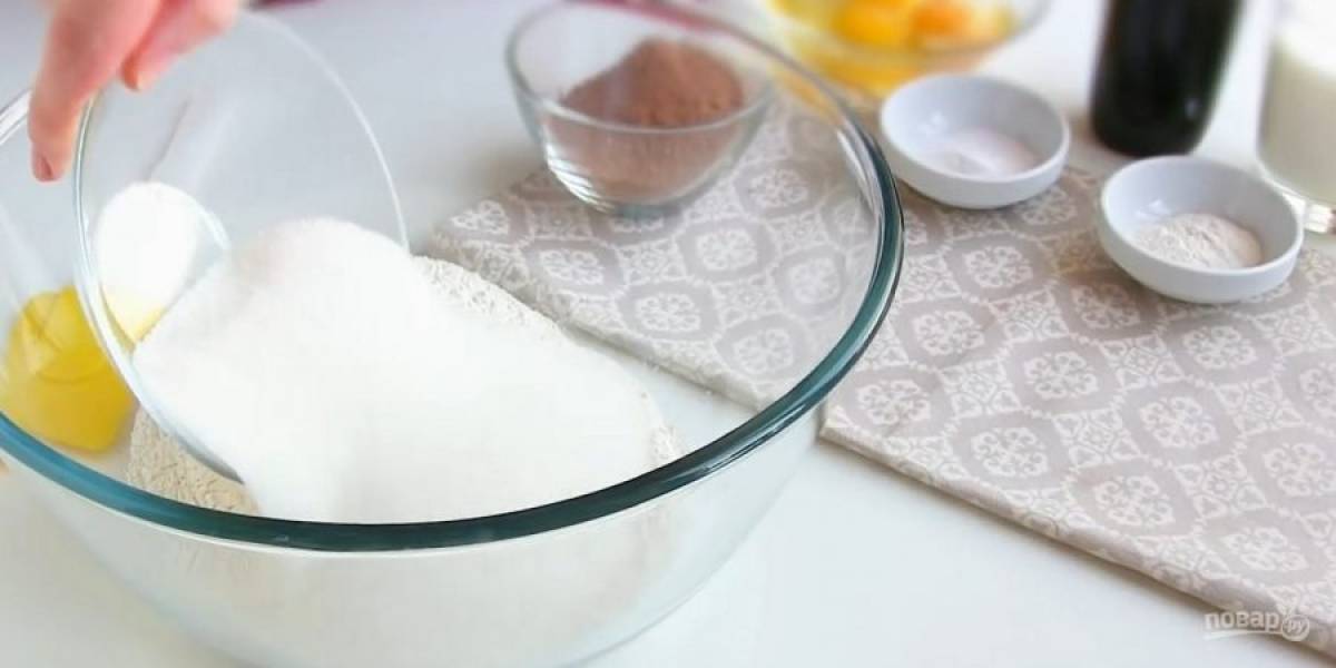 1. Просеянную муку смешайте с сахаром, какао, разрыхлителем и содой. Заварите крепкий кофе, дайте ему остыть. Добавьте к сухим ингредиентам яйца, кефир, кофе, растительное масло и перемешайте смесь миксером в течение минуты.
