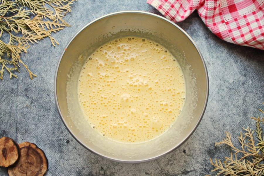 Яйца разбейте в миску, добавьте щепотку соли и взбивайте до легкой пены. Взбивая, всыпьте ванильный сахар и частями обычный сахар. Взбивайте до пышной, светлой массы, примерно 7-8 минут.