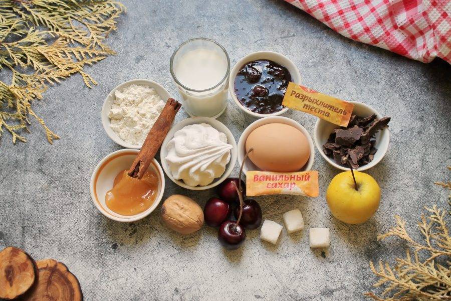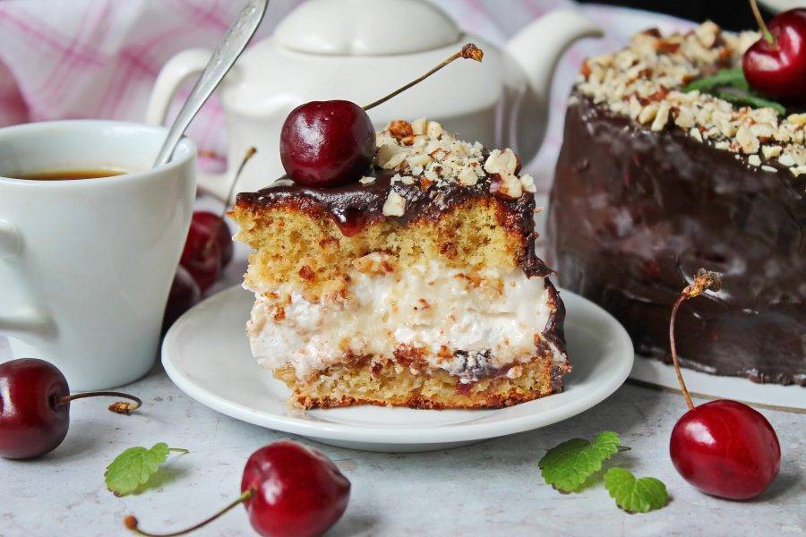 Если вы любите шарлотку с яблоками, вам точно понравится этот торт! В воздушном бисквите орехи и дольки свежих яблок. Прослойка из сливок и зефира отлично дополняется шоколадом и вишневым джемом.