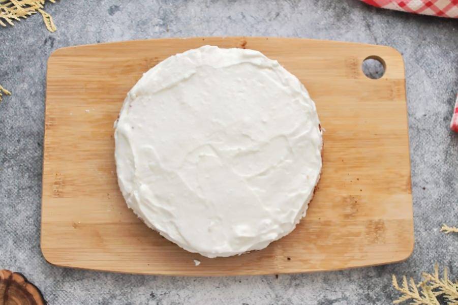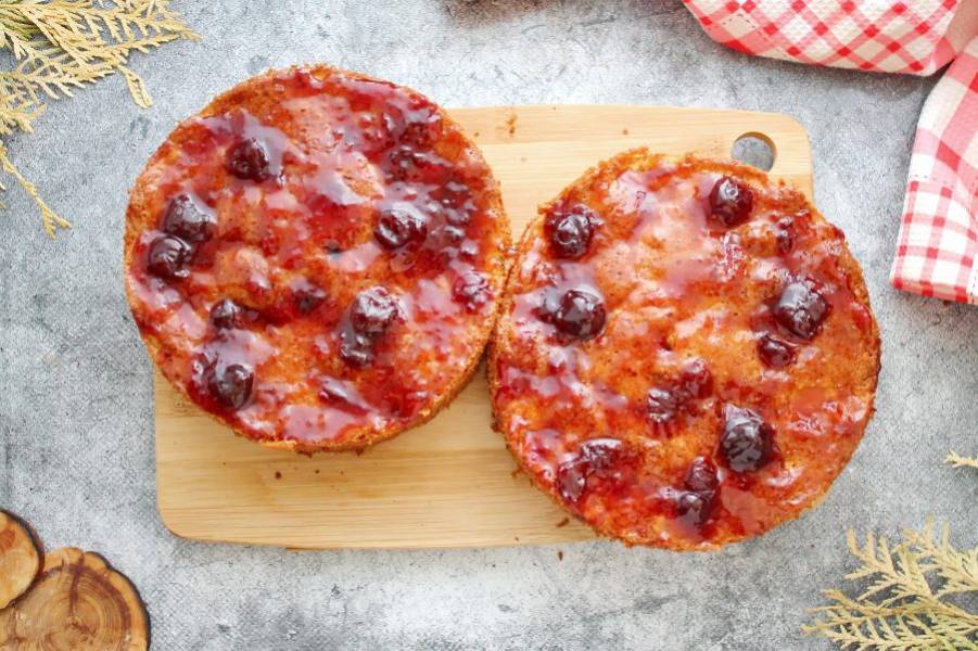 Бисквиты остудите в форме, после этого проведите ножом по стенкам и достаньте. Удалите пергамент со дна и смажьте верх обоих бисквитов вишневым джемом.