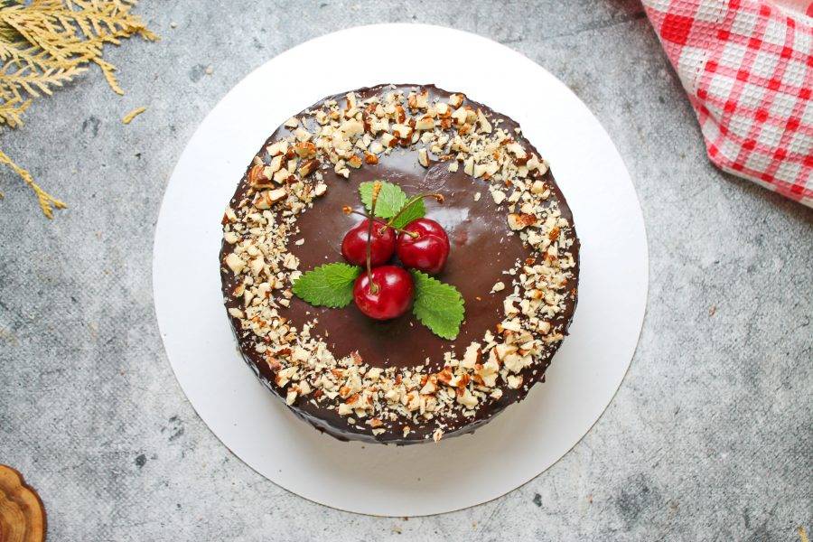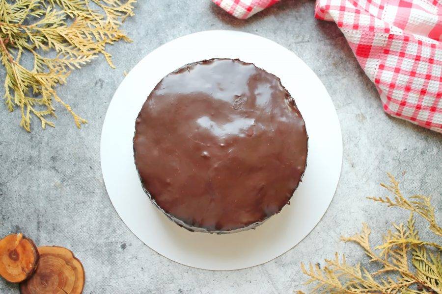 Сливки нагрейте на медленном огне, но не доводите до кипения. Шоколад измельчите и залейте сливками, перемешайте до однородного состояния. Выложите второй бисквит на крем и немного прижмите, чтобы слои сцепились. Залейте торт шоколадной глазурью и уберите в холодильник на 2-3 часа до застывания.