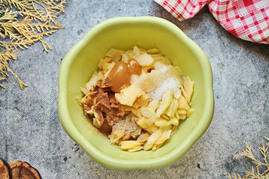 Яблоки вымойте и обсушите. Очистите их от кожуры, сердцевины, нарежьте тонкими кусочками, выложите в миску. Добавьте к яблокам мед, корицу, мускатный орех и одну чайную ложку сахара. Перемешайте и уберите в холодильник.