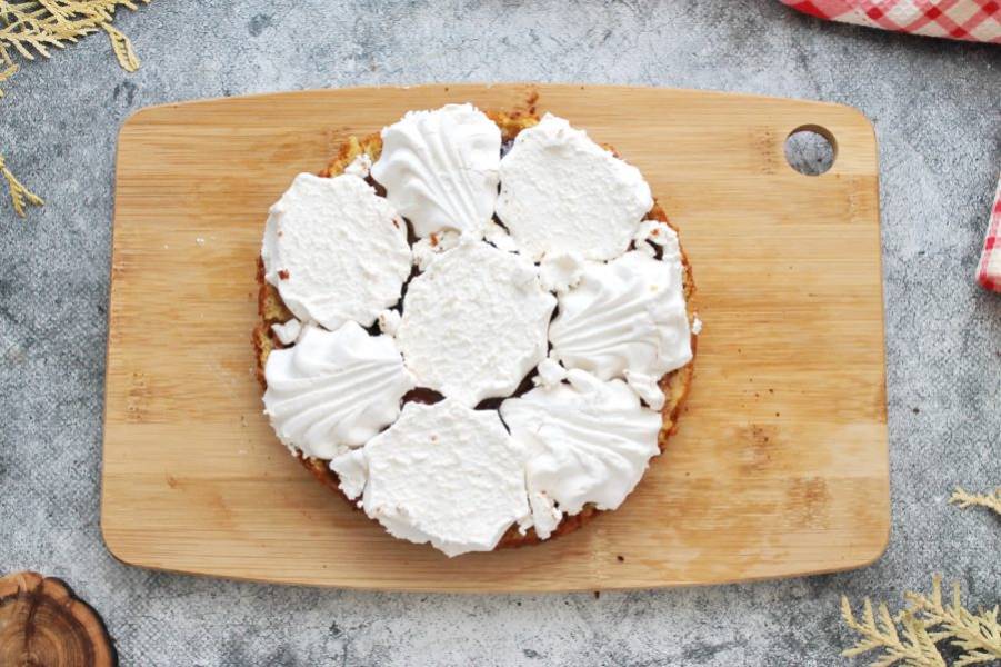 Разложите на поверхности одного из бисквитов половинки зефира, заполняя все пространство.