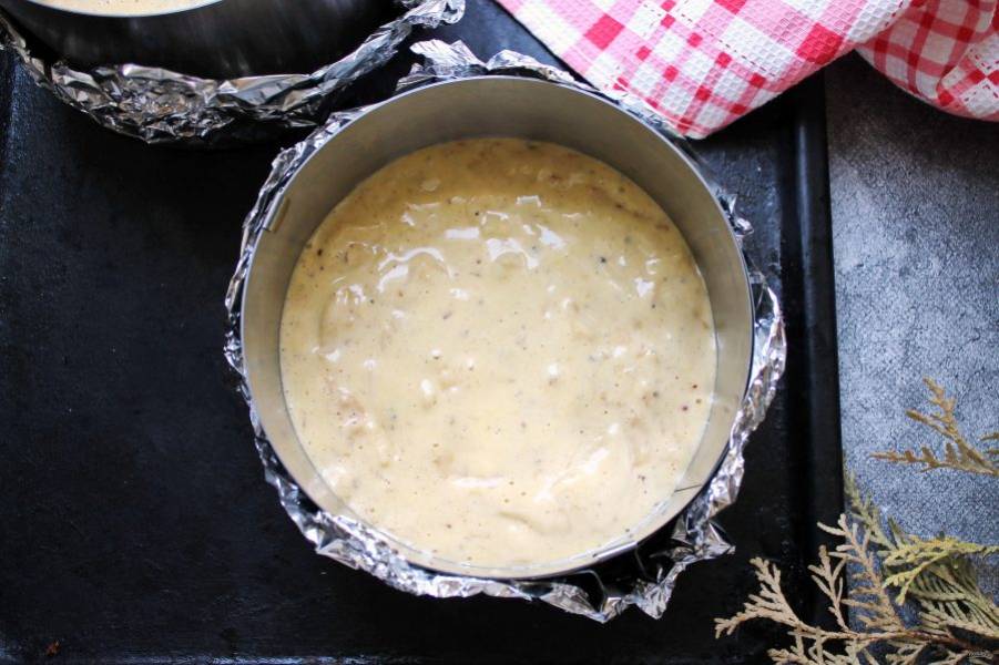 Дно разъемных форм проложите пергаментом. Разлейте тесто в две разъемные формы диаметром 20 сантиметров.