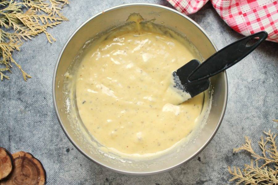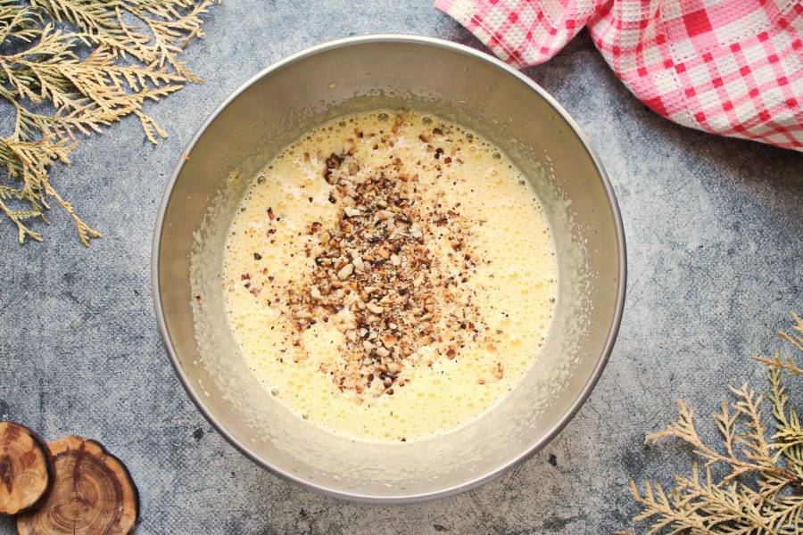 Всыпьте в яичную массу орехи и аккуратно перемешайте.