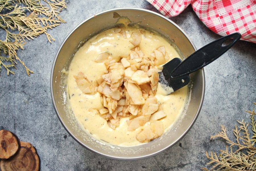 Выложите в тесто подготовленные яблоки, не добавляя жидкость и аккуратно перемешайте.