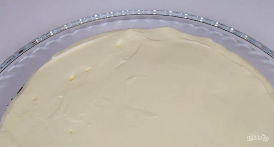 6. На нижний корж нанесите крем, разровняйте и подобным образом соберите весь торт. Поставьте торт в холодильник на час. Оставшийся крем соедините с крошками от обрезков коржей и поставьте в холодильник.