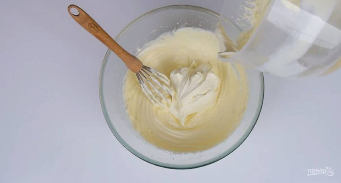 5. Сливочный сыр комнатной температуры тщательно размешайте и соедините с масляной смесью в два этапа. Крем поставьте в холодильник на 30 минут. Переложите часть крема в кондитерский мешок.