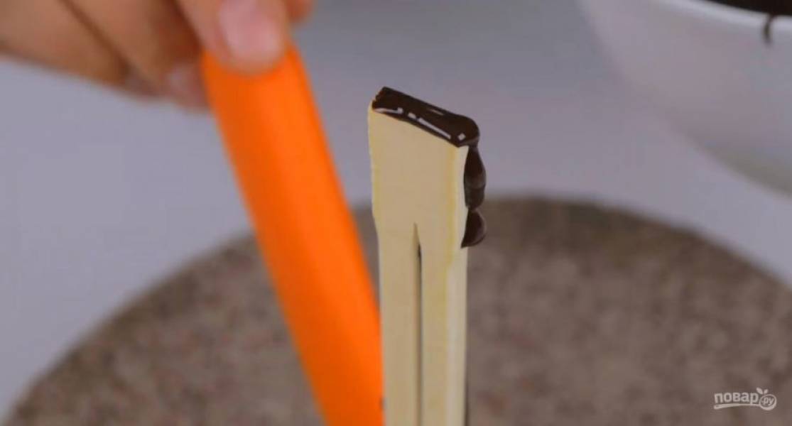 7. Верх и бока торта смажьте оставшимся кремом и поставьте в холодильник на 5-6 часов. В центр торта установите одноразовые палочки для еды, смажьте их темперированным шоколадом и дайте ему застыть.
