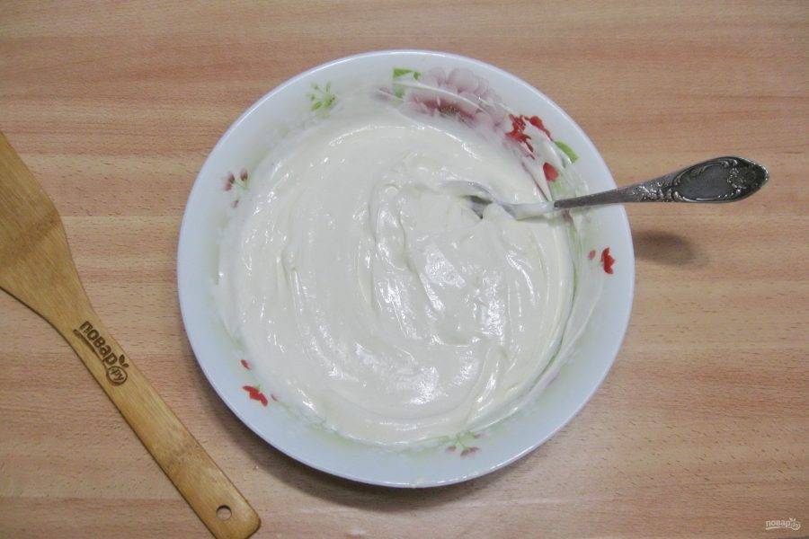 Приготовьте крем для торта. Сметану выложите в миску, добавьте сахарную пудру.
