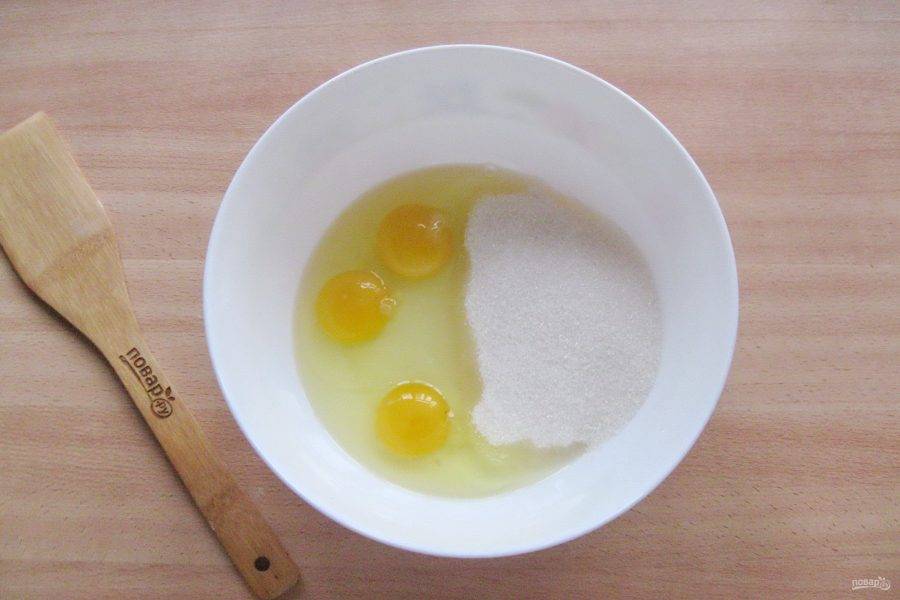 Приготовьте тесто для торта. В миску разбейте яйца и насыпьте сахар.