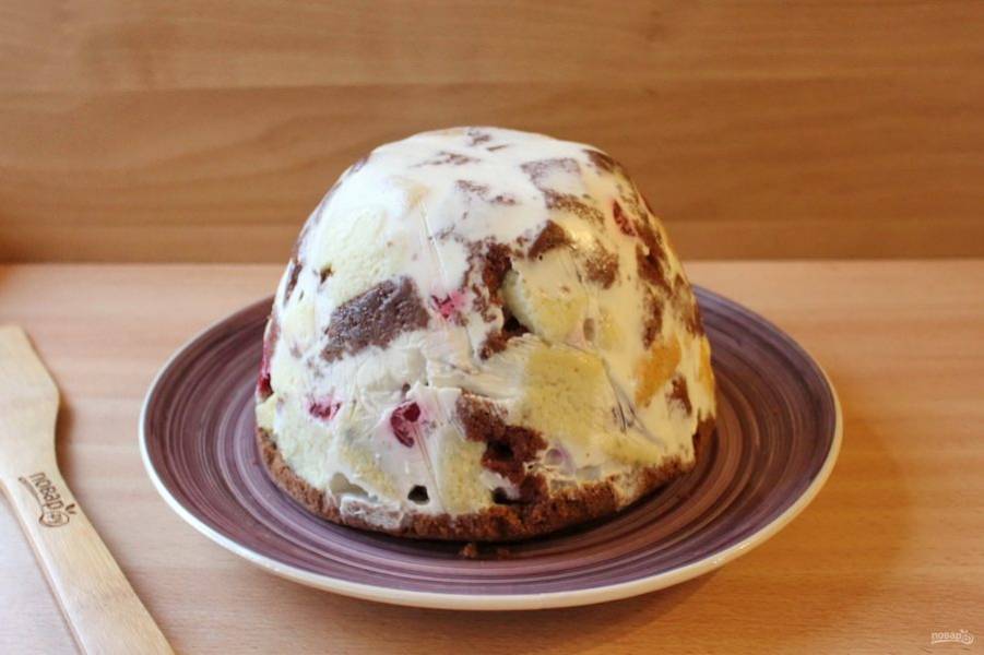 После разверните пленку и переверните миску с тортом на блюдо. Снимите миску и пленку.