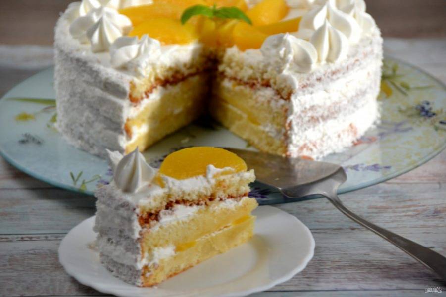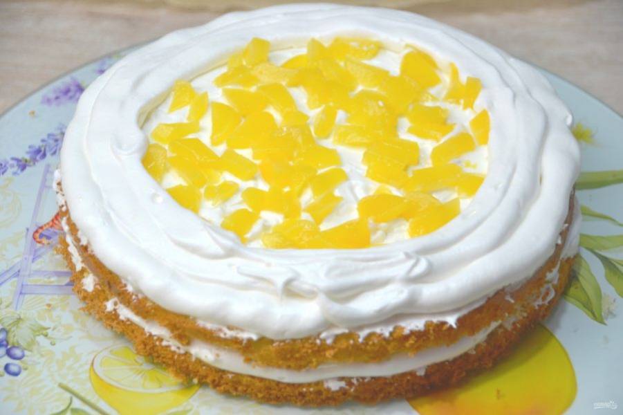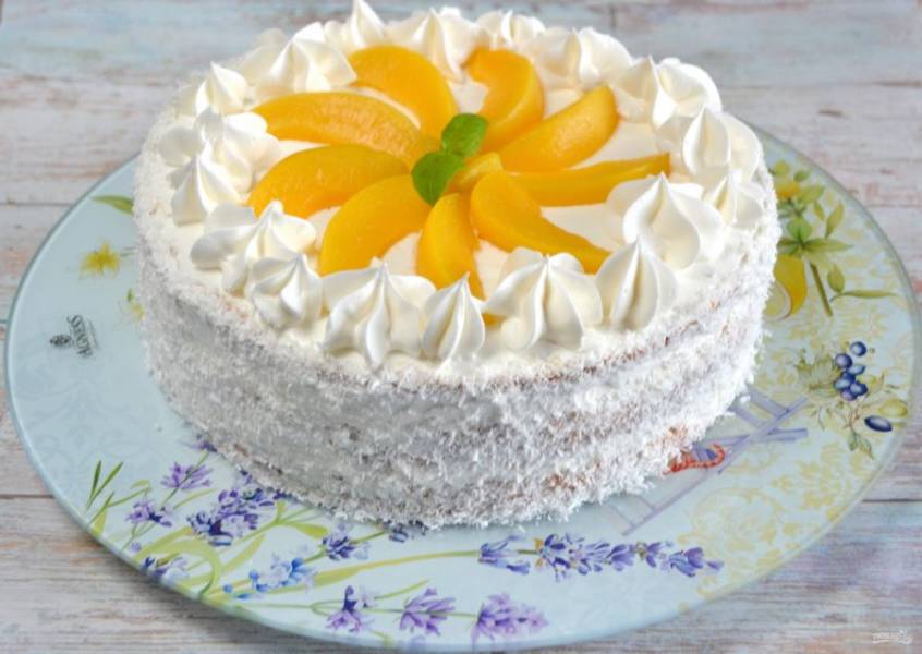 Выложите сверху третий корж, декорируйте бока и верх торта оставшимся кремом и персиками по своему вкусу. Можно слегка обсыпать кокосовой стружкой. Такой торт точно украсит любой праздничный стол.