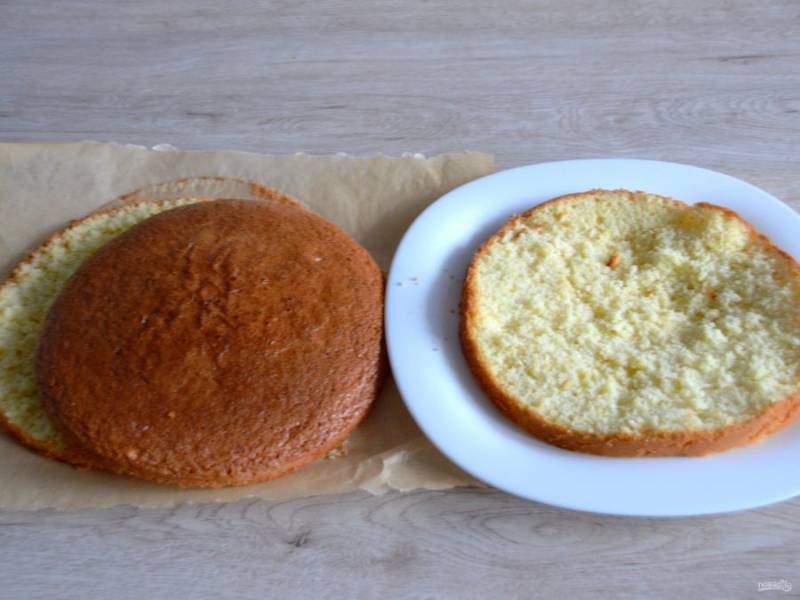 Охладите бисквит до комнатной температуры, в идеале его следует завернуть в пищевую пленку и дать "созреть" 5-6 часов. Разрежьте бисквит на 3 коржа.