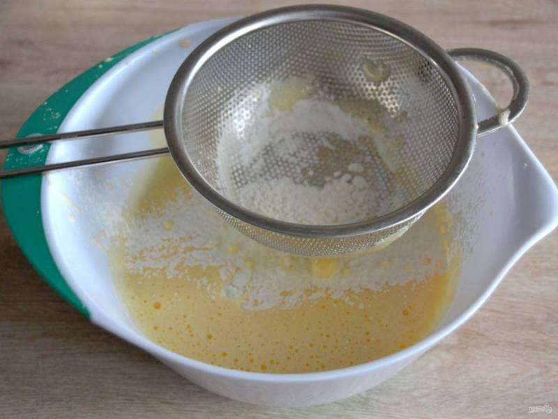 Всыпьте в миску через сито сначала крахмал, вмешайте силиконовой лопаткой, затем частями просейте муку и тоже вмешайте силиконовой лопатой до однородности.