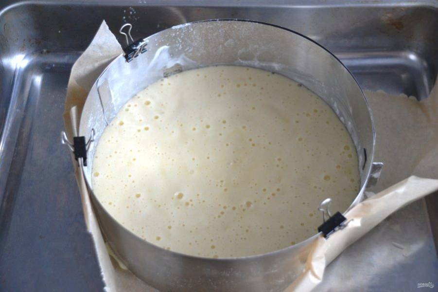 Подготовьте форму для запекания диаметром 22-23 см., смажьте сливочным маслом, присыпьте мукой, излишки муки стряхните. Выложите тесто в форму, разогрейте духовку до 180 градусов.