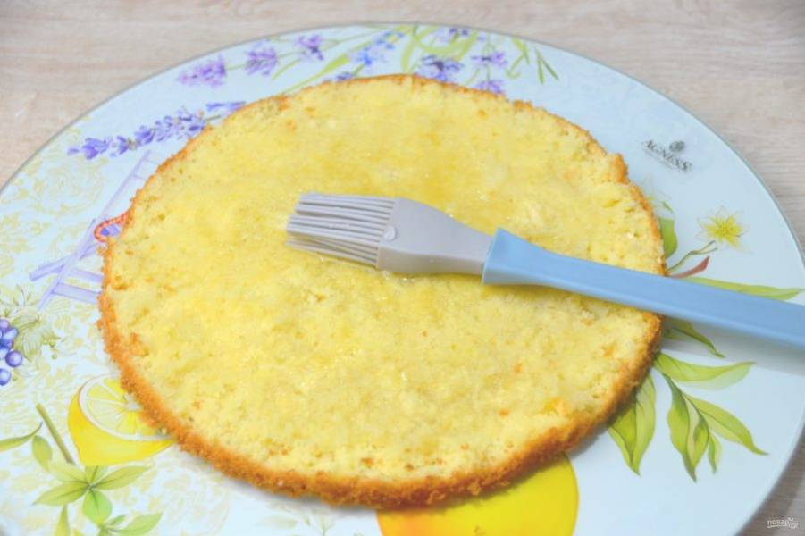 Для сборки торта выложите первый корж на блюдо. Смажьте его с помощью силиконовой кисти сиропом от персиков. Если сироп очень сладкий, его можно по вкусу разбавить кипяченой водой.