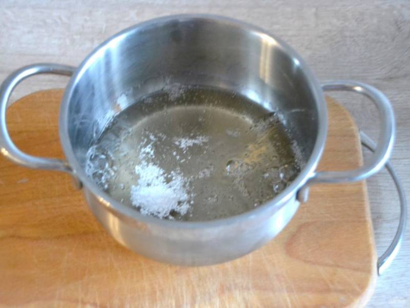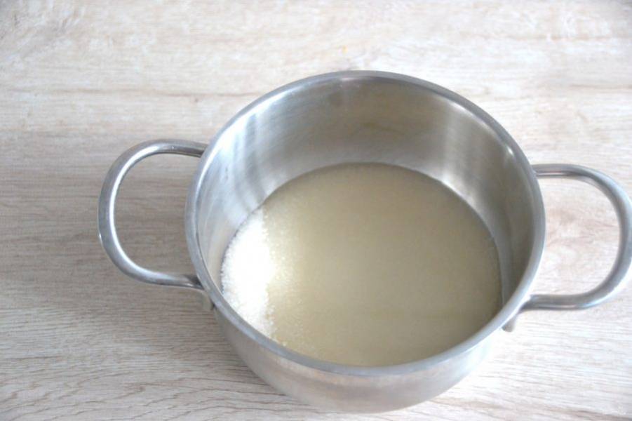 Для приготовления белкового заварного крема всыпьте в сотейник 180 грамм сахара, залейте горячей водой, поставьте на небольшой огонь, мешать не надо.