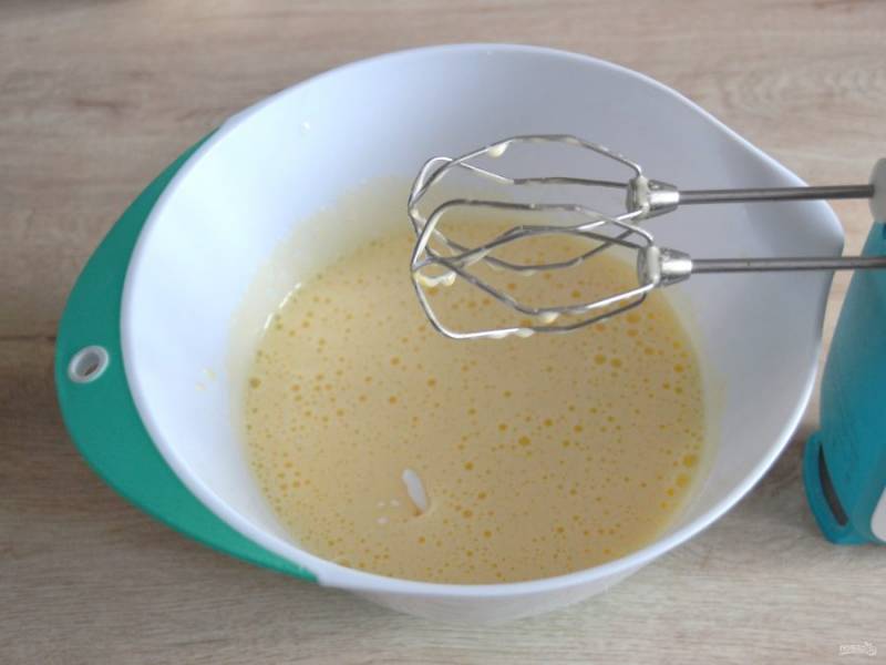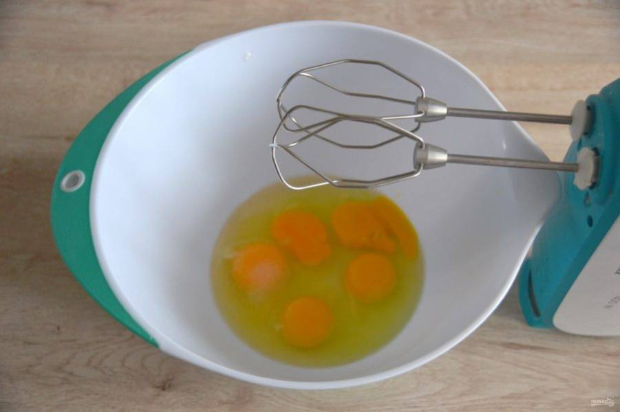 В миску для приготовления теста вбейте 5 яиц.