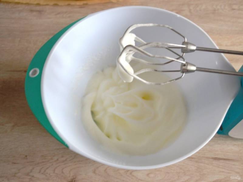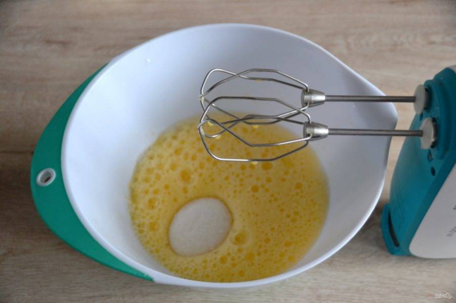 Всыпьте сахар, продолжайте взбивать с сахаром.