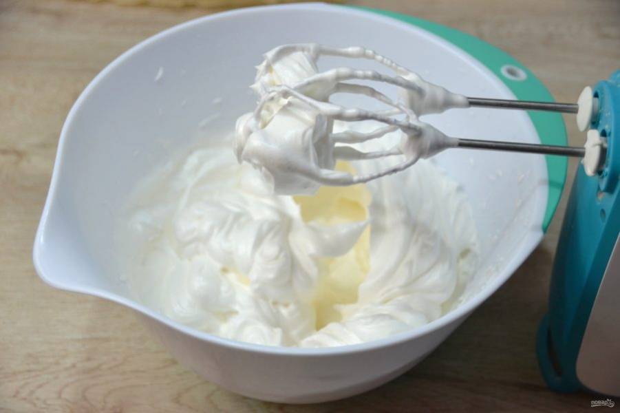 Одновременно взбейте яичные белки с небольшой щепоткой соли до мягких пиков.