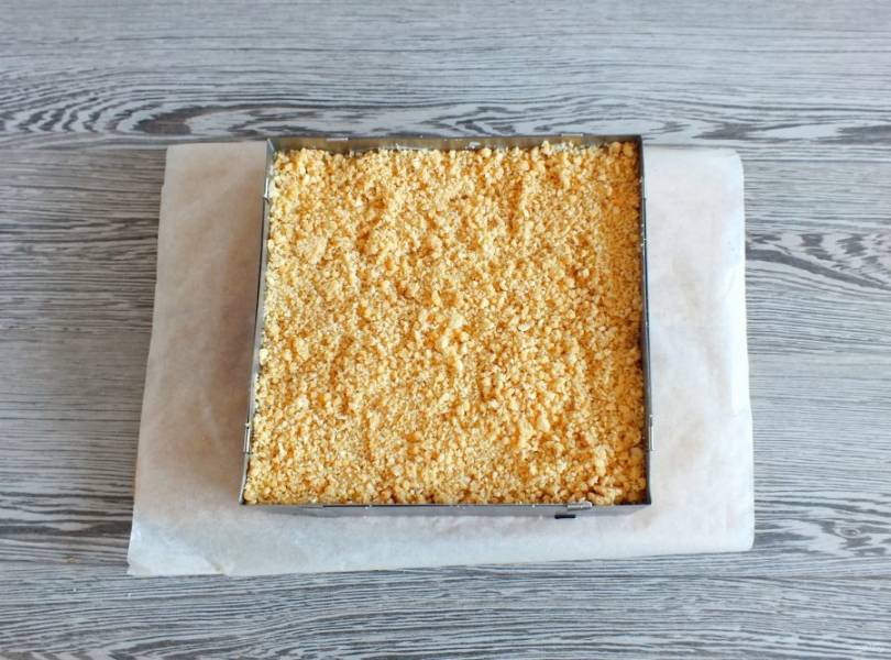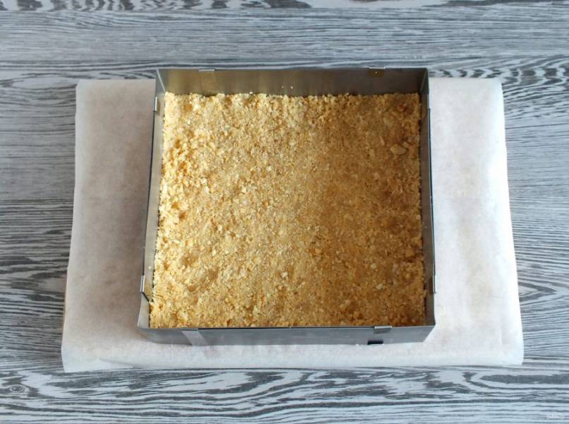 Возьмите разъемную форму и выложите 2/3 часть печенья с маслом. Толщина слоя должна быть 1-1,5 см. Утрамбуйте очень сильно ладонью. Уберите в холодильник.
