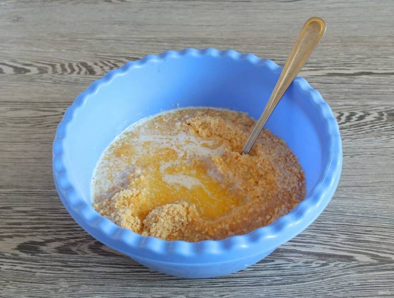 Добавьте растопленное масло к измельченному печенью. Перемешайте ложкой.