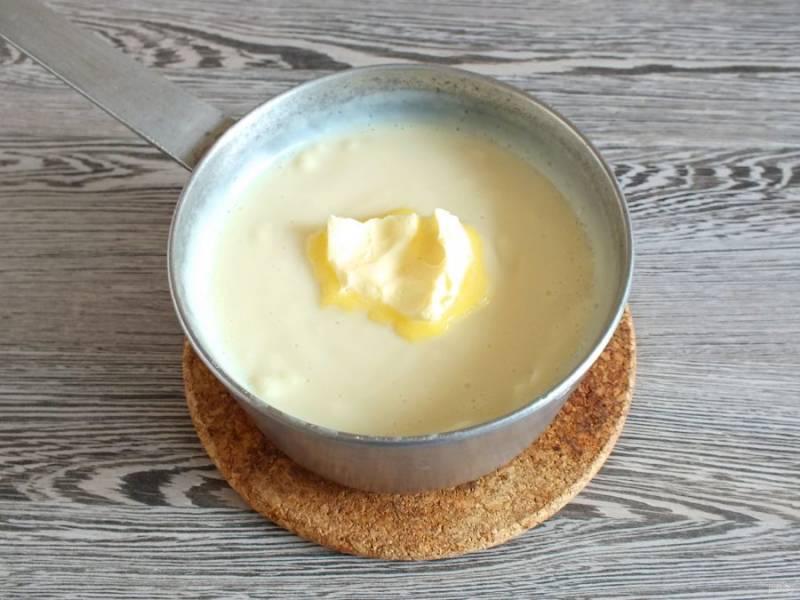 Снимите с огня и добавьте сливочное масло. Размешайте. Охладите сначала при комнатной температуре, а потом охладите в холодильнике от 1 до 2 часов. Важно, чтобы крем загустел!