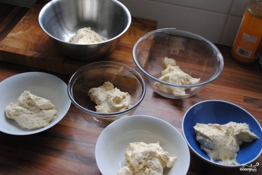 Взбить миксером сахар и масло. В другой миске смешать муку, крахмал, порошок для выпечки. К маслу добавлять по одному яйцу чередуя с мукой. Постепенно замесить тесто, добавив ванилин и 3 ст. л. молока. Тесто разделить на 6 частей.