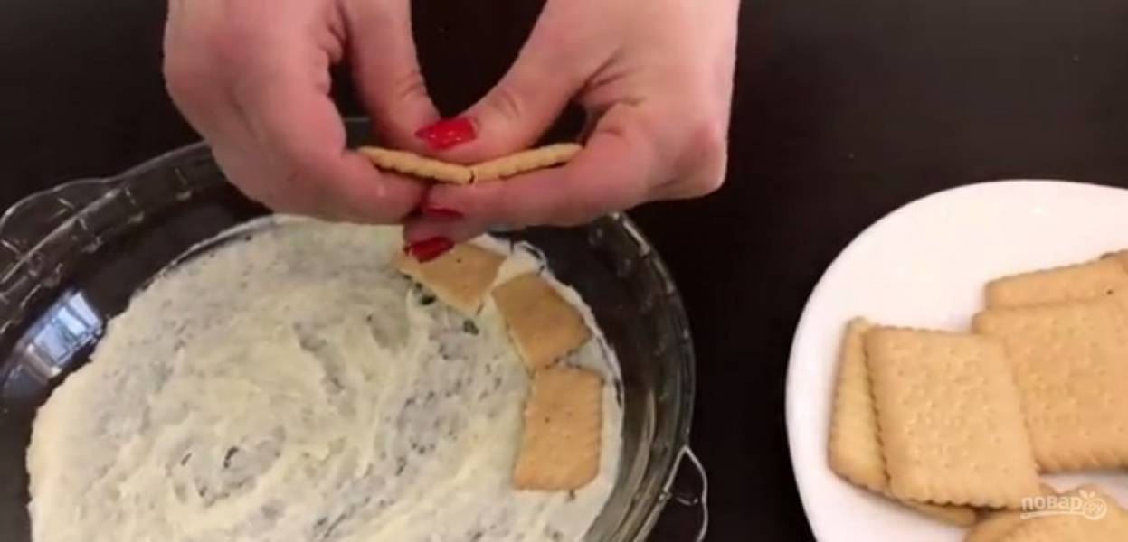 3. Сверху выложите весь крем, распределите его по печенью. Сверху выложите слой печенья. Сливки хорошо взбейте миксером до устойчивой массы, после чего добавьте сахарную пудру и снова взбейте. Выложите сливки сверху на торт и разровняйте.