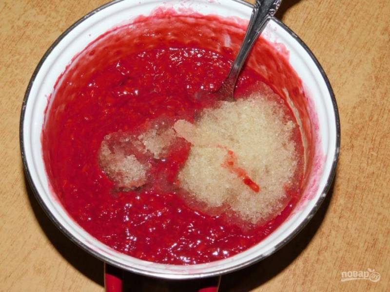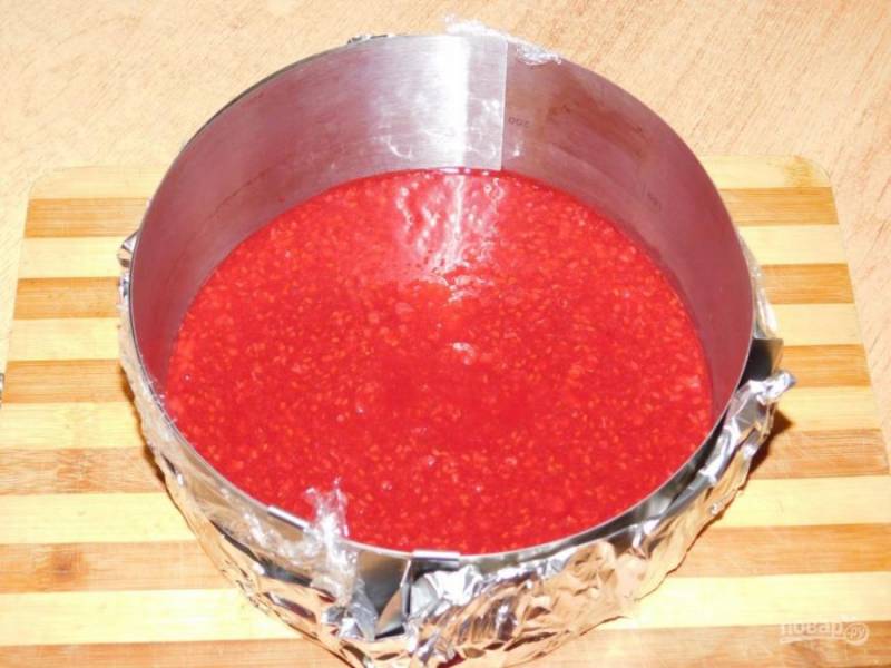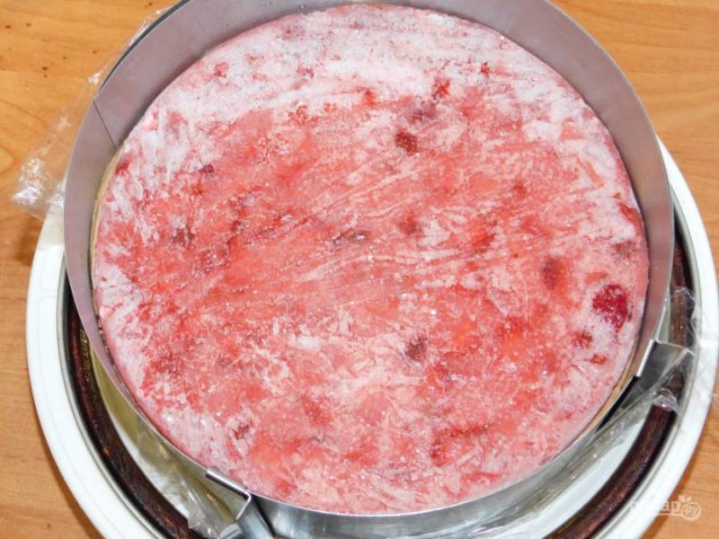 Вылейте клубничную начинку в форму (диаметр 18 см.) и заморозьте.