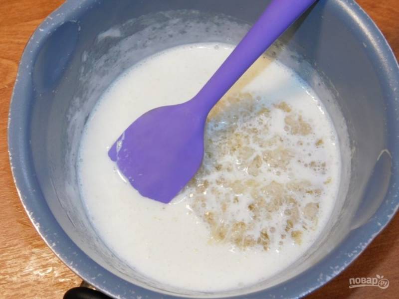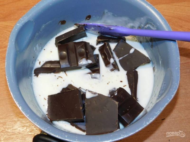 Затем добавьте в них шоколад, поломанный на кусочки. Размешивайте до полного его растворения. Смесь остудите.