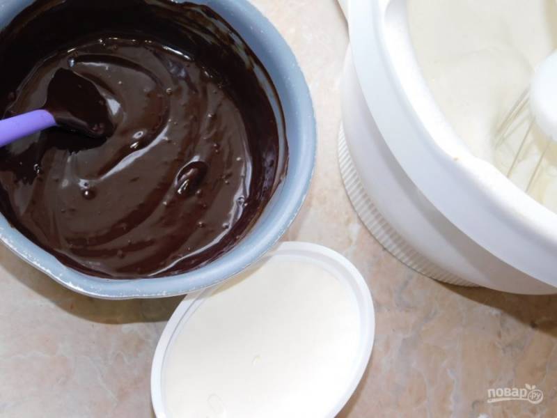 Взбейте до полувзбитого состояния 300 грамм сливок и смешайте их с шоколадной массой и мягким творожным сыром.