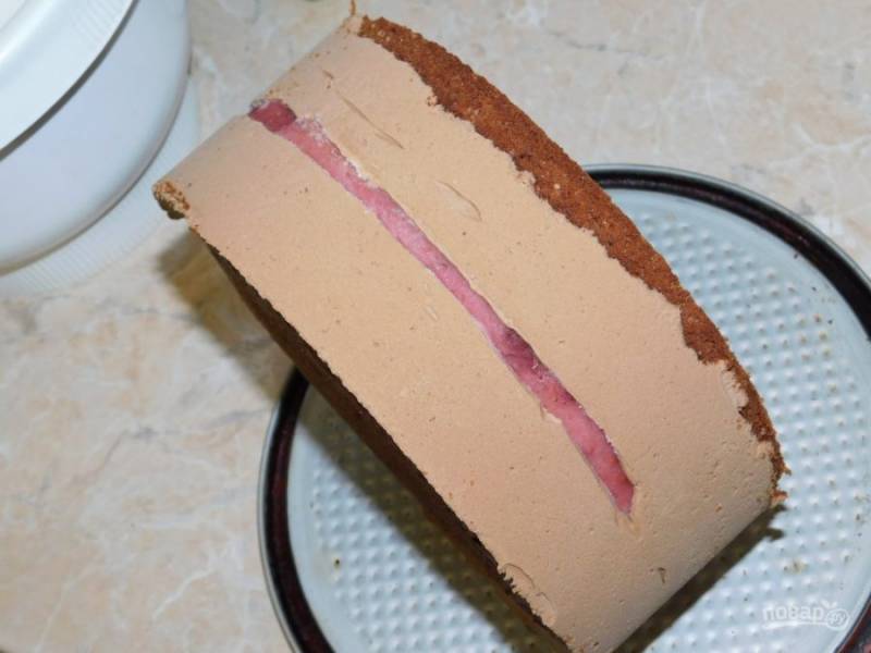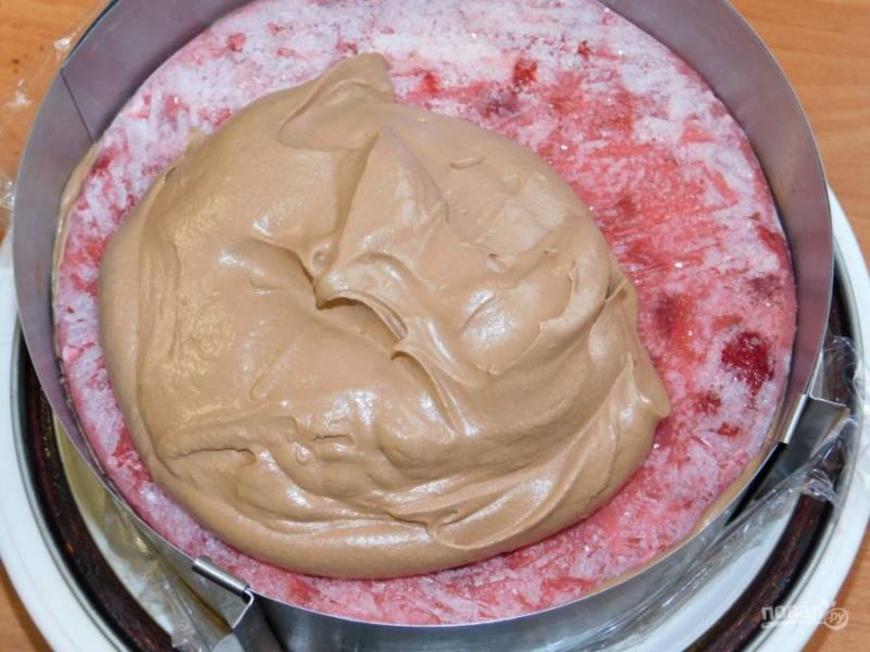 Выложите второй слой шоколадного бисквита. Поставьте в морозилку для заморозки.