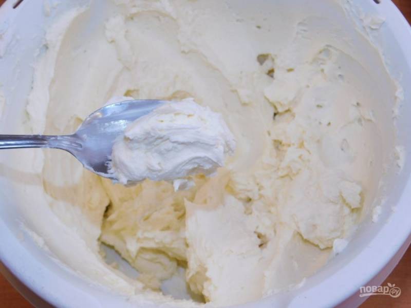 Для выравнивания торта приготовьте крем-чиз. Для этого взбейте сливочное масло с сахарной пудрой. Затем вмешайте творожный сыр.