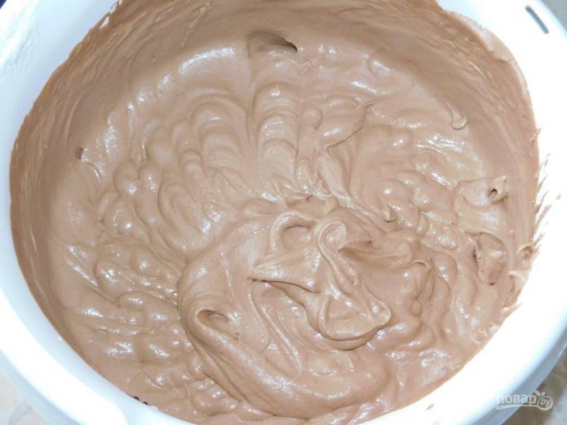 Первым делом приготовьте шоколадный бисквит. Для этого взбейте яйца с сахаром в пышную пену. Затем вмешайте муку и какао.