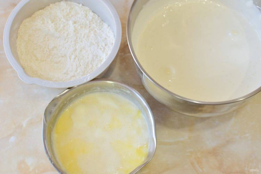 Муку смешайте с содой. К взбитым яйцам поочередно добавляйте молочную и мучную смесь. Вмешивайте все вручную с помощью венчика, чтобы сохранить пышность теста от взбитых яиц.