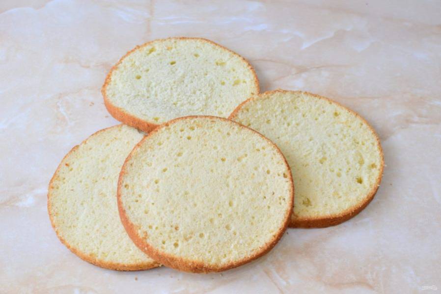 Готовый бисквит немного увеличится в размере, подрумянится и будет пружинить при надавливании. Извлеките его из духовки и остудите. Затем оберните пищевой пленкой и уберите на ночь в холодильник. Перед сборкой торта разрежьте бисквит на 3-4 коржа.