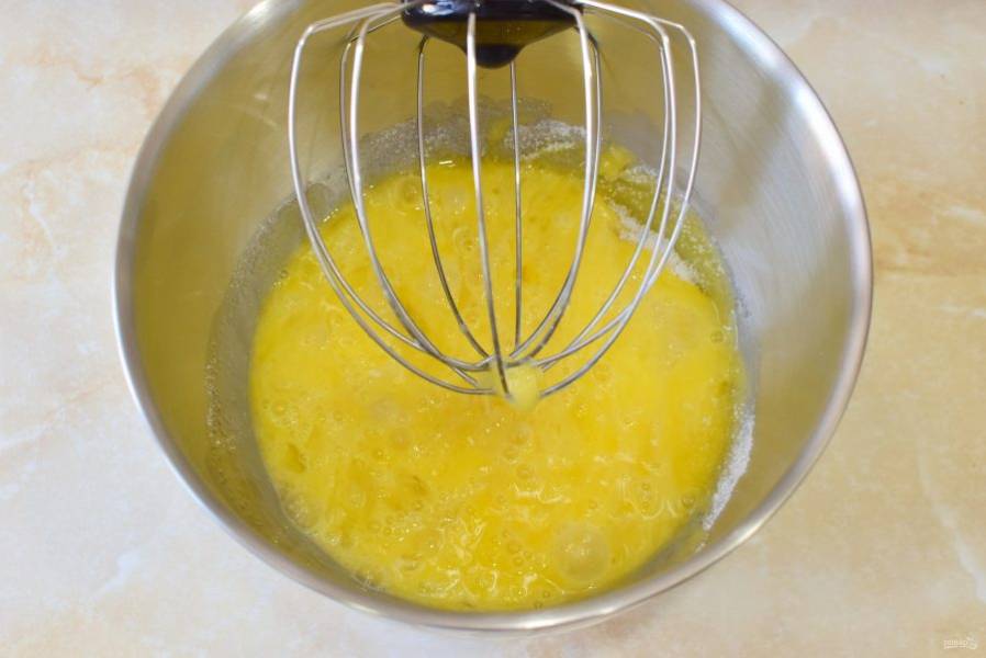 Яйца соедините с сахаром и взбейте до густой пышной массы.