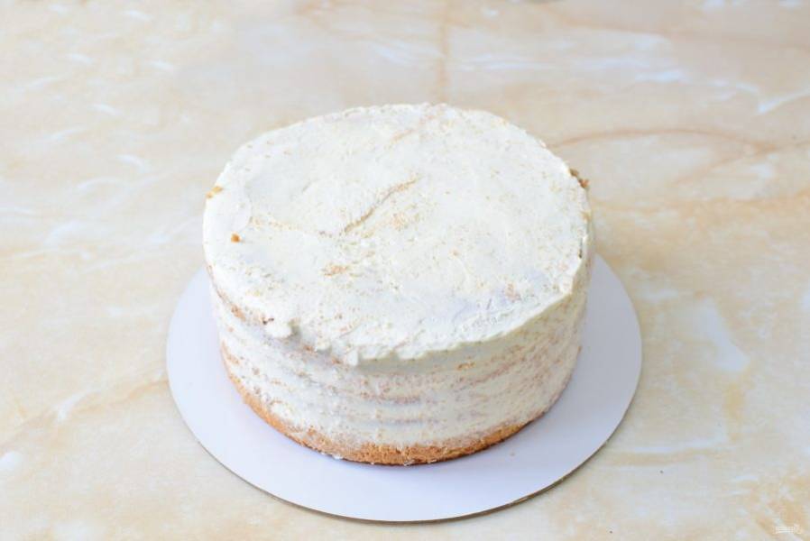 Соберите торт. Оберните его ацетатной пленкой и затяните в кольцо. Уберите в холодильник не менее, чем на 6 часов. Можно оставить на ночь.