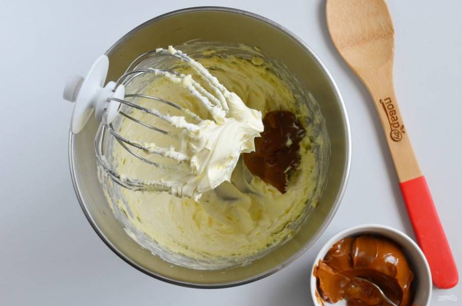 Добавляйте в сливочное масло вареную сгущенку по столовой ложке за раз.