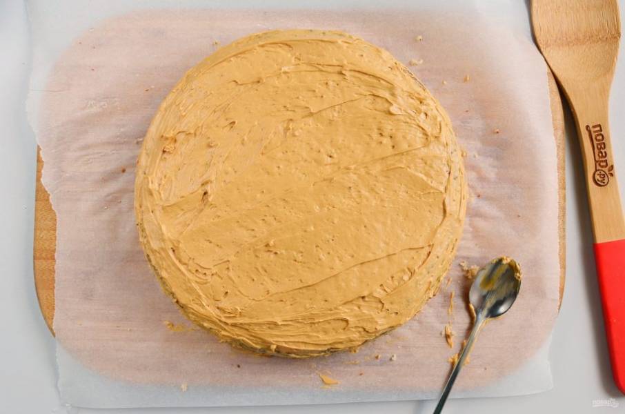 Далее выложите второй корж, пропитайте его, смажьте кремом. Далее третий корж, пропитка и оставшийся крем. Смажьте немного бока торта.