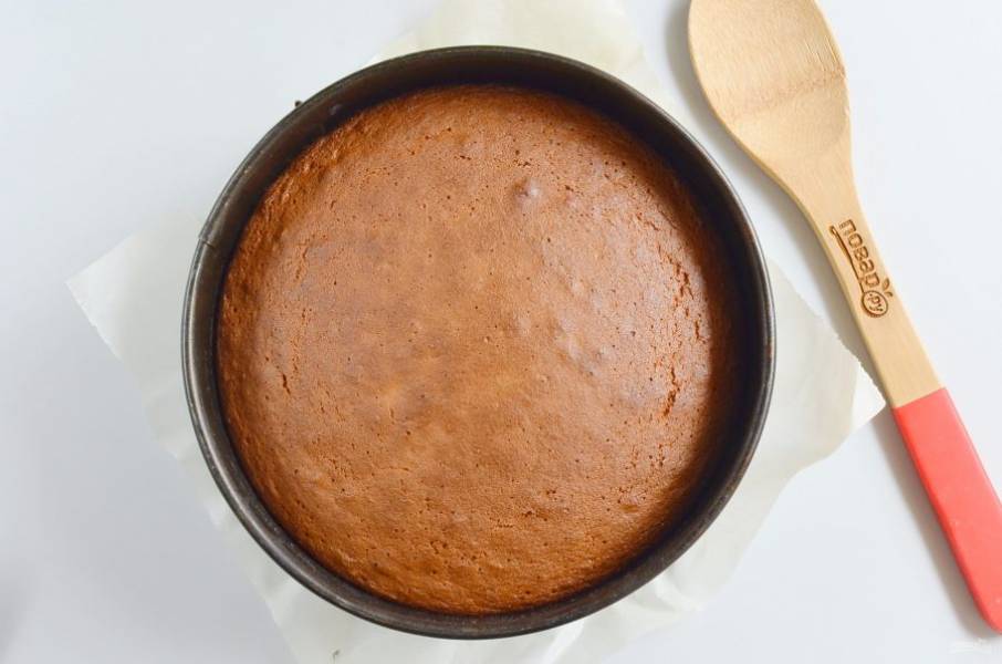 Выпекайте бисквит до готовности, зубочистка должна выходить сухая. Остудите немного бисквит в форме, потом осторожно снимите кольцо и остудите полностью на решетке.