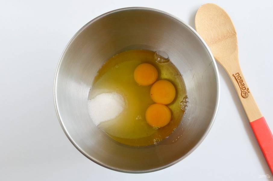 В чашу миксера разбейте три яйца, добавьте сахар. Взбивайте 5-7 минут на максимальных оборотах до появления плотной светлой пены.