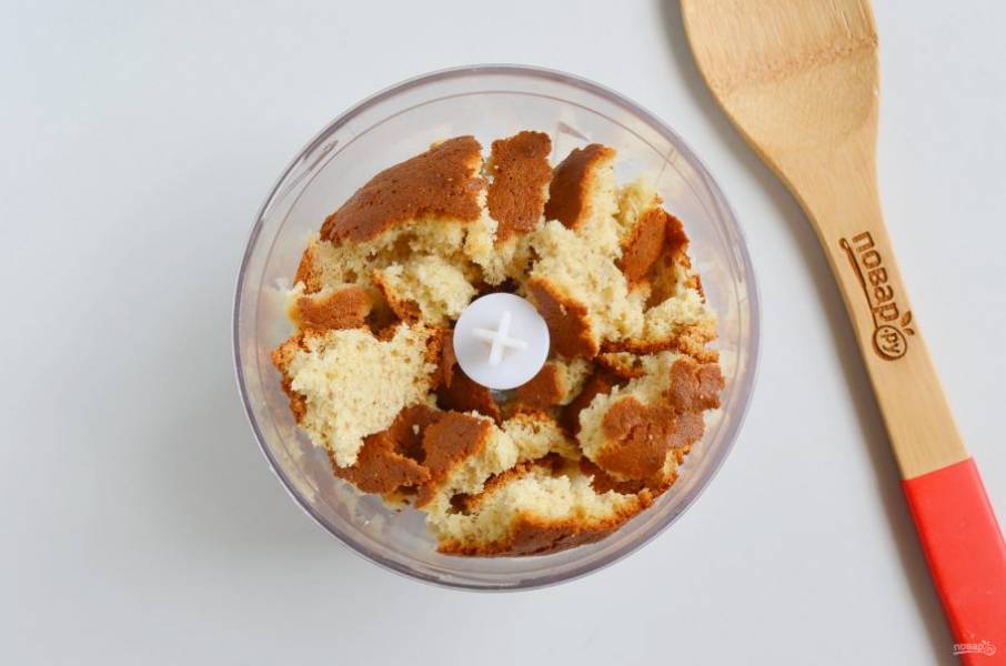 Верхушку бисквита поломайте на кусочки и выложите в чашу измельчителя.